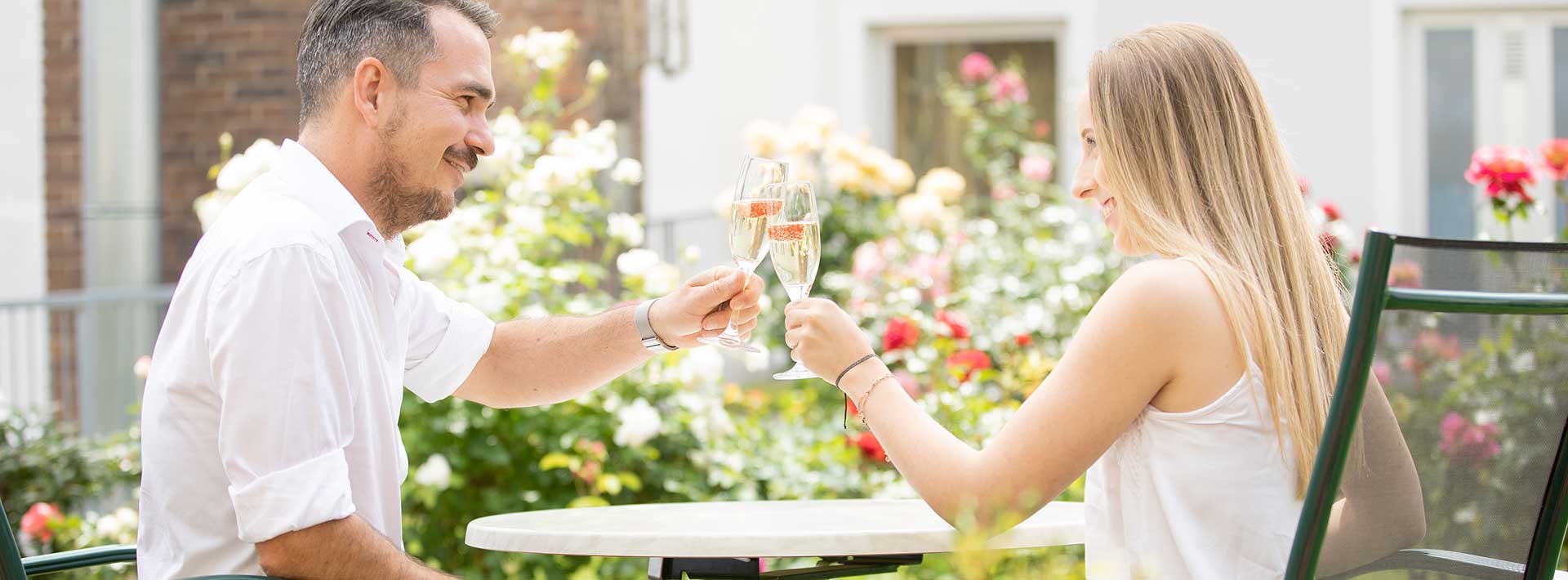 Zwei Personen stoßen mit Prosecco an – romantischer Moment im Garten des Hotel Gollner Graz.